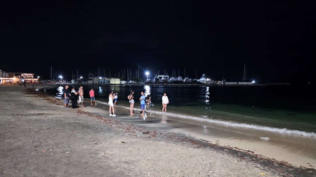 Pasé por el letrero turístico de Santa Marta, ese que tantos viajeros buscan para tomarse su foto del recuerdo. Luego caminé por la orilla de la playa, y aunque el sol ya no brillaba, la magia seguía intacta. Algunas personas se bañaban en el mar bajo la luz tenue de la luna; otras caminaban descalzas por la arena o simplemente se sentaban a escuchar el suave vaivén de las olas. Una postal de paz nocturna que contrasta con el bullicio de la rumba.